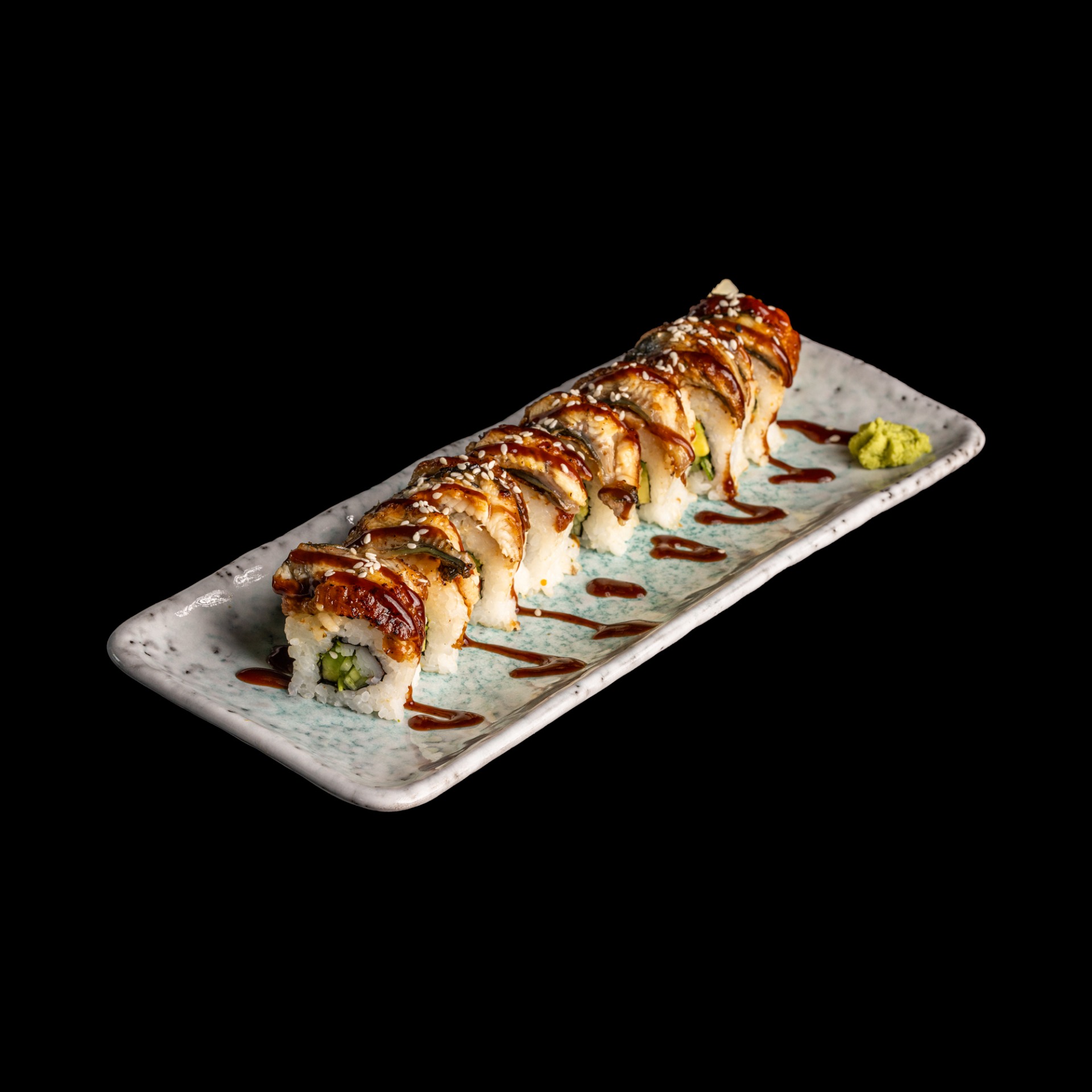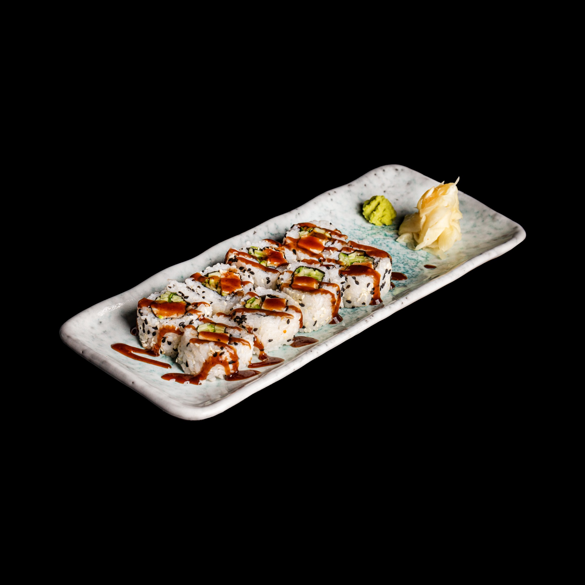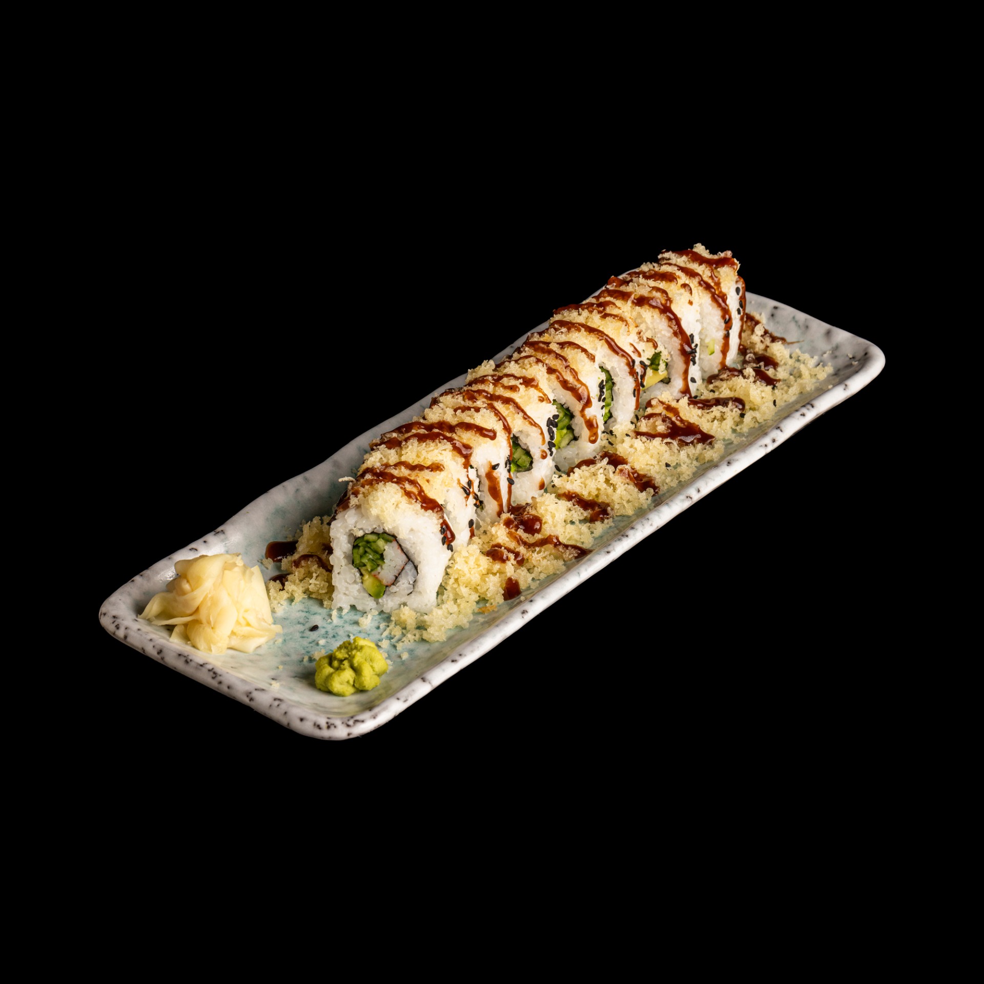 Crabstick, avocado, cucumber topped with grilled eel fish with teriyaki sauce and sesame seeds.