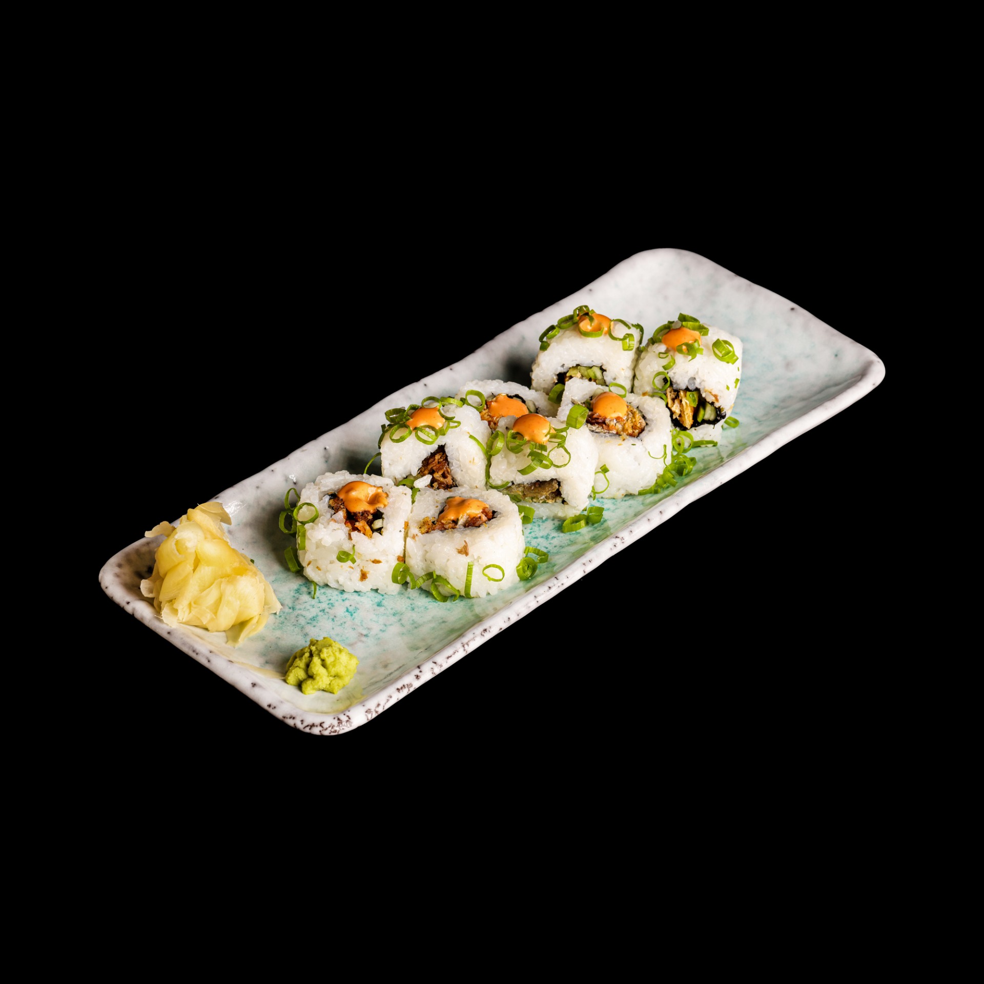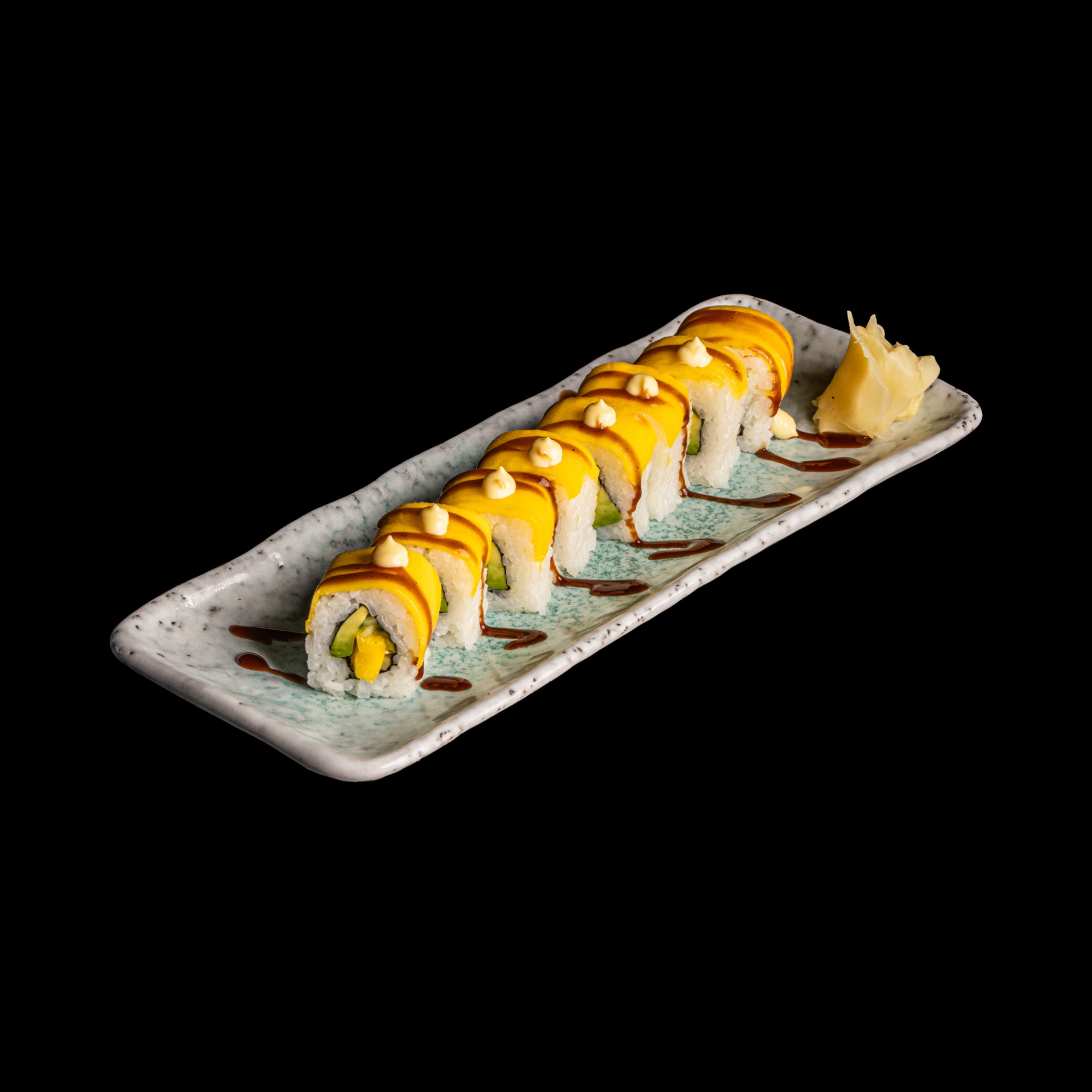 mango, avocado, cucumber top with mango, Japanese mayo and teriyaki sauce.
