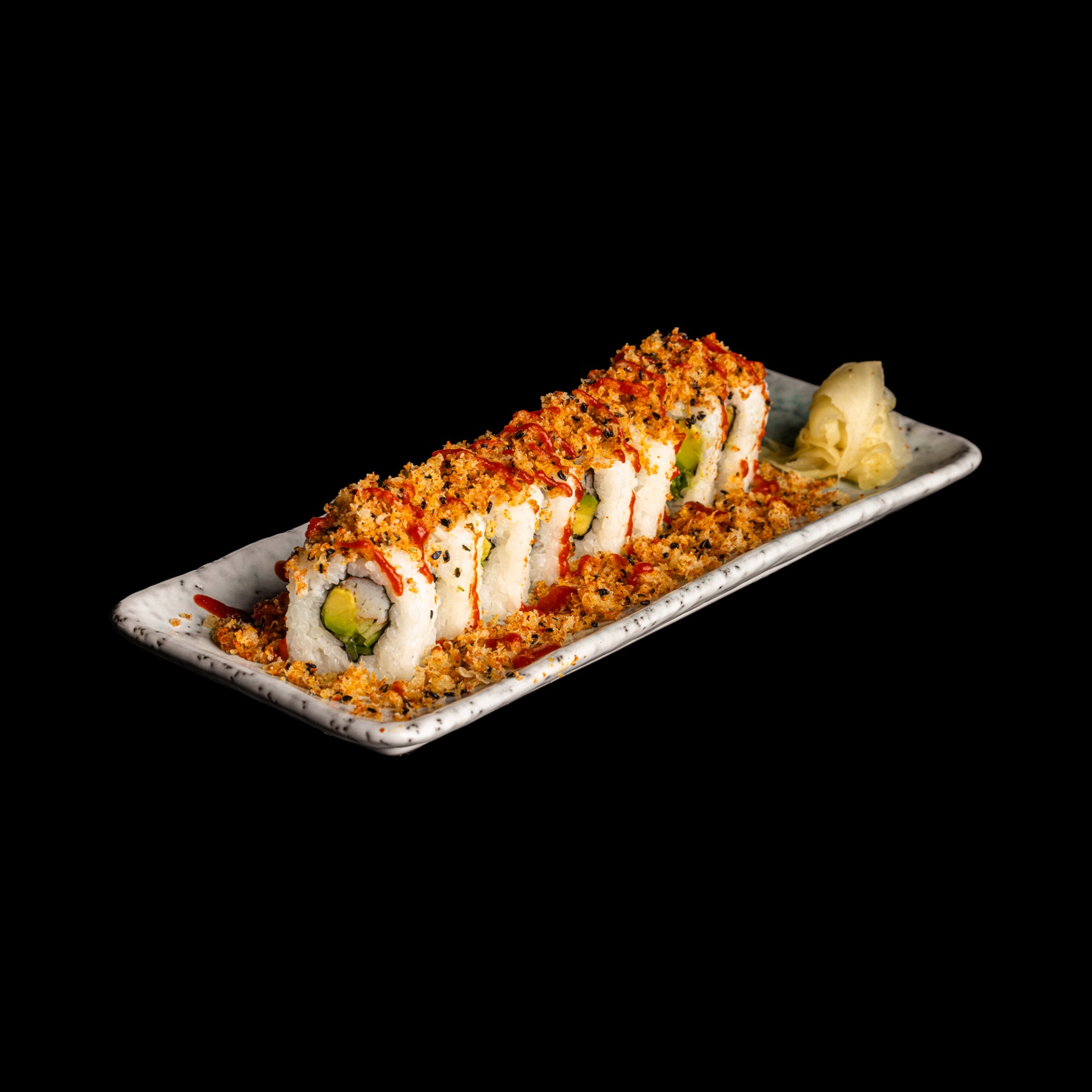 avocado, cucumber rolled in roasted sesame seed topped with crunchy tempura