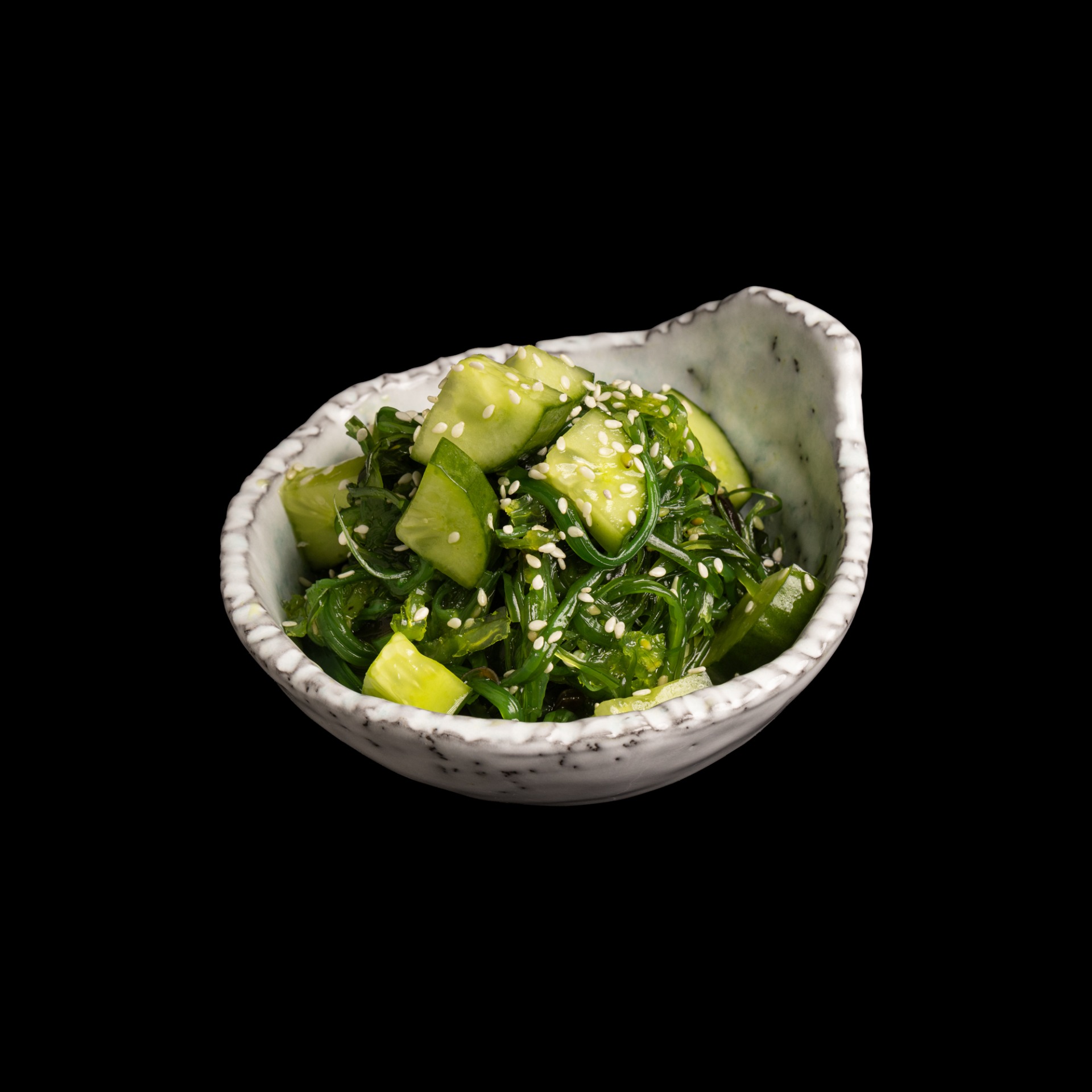 Sliced cucumber and sweet wakame seaweed, topped with sesame seeds.