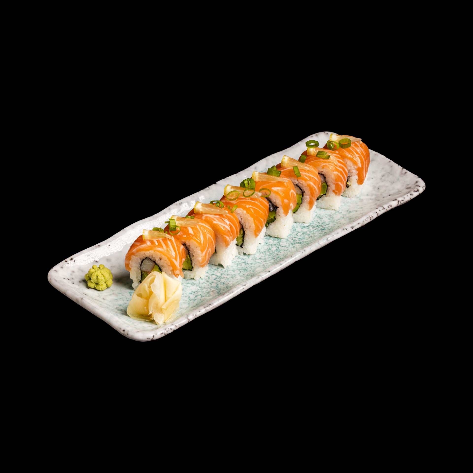 California roll topped with fresh salmon, spring onion, and lemon garnish.