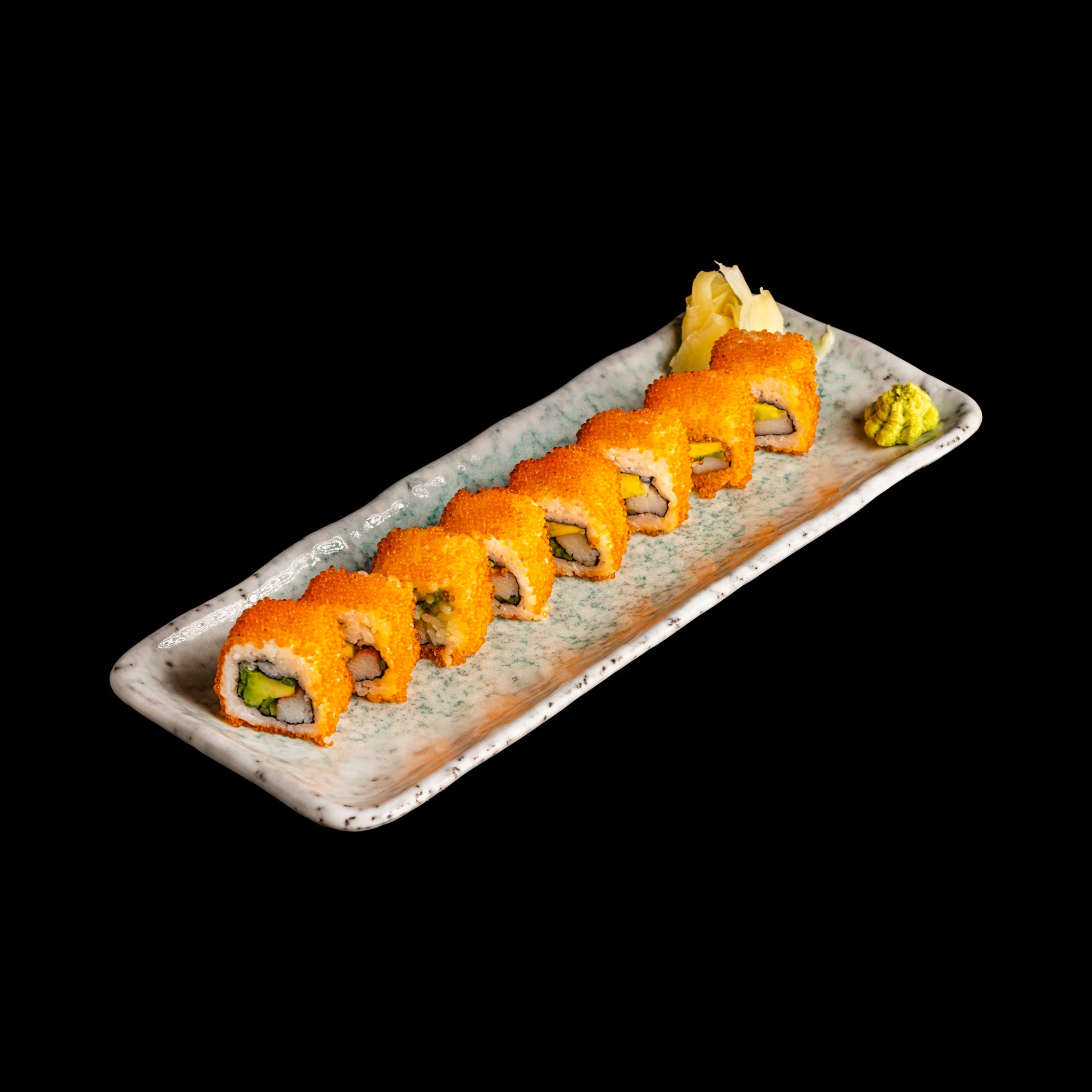 Volcanic roll with shrimp tempura, crabstick, and avocado,