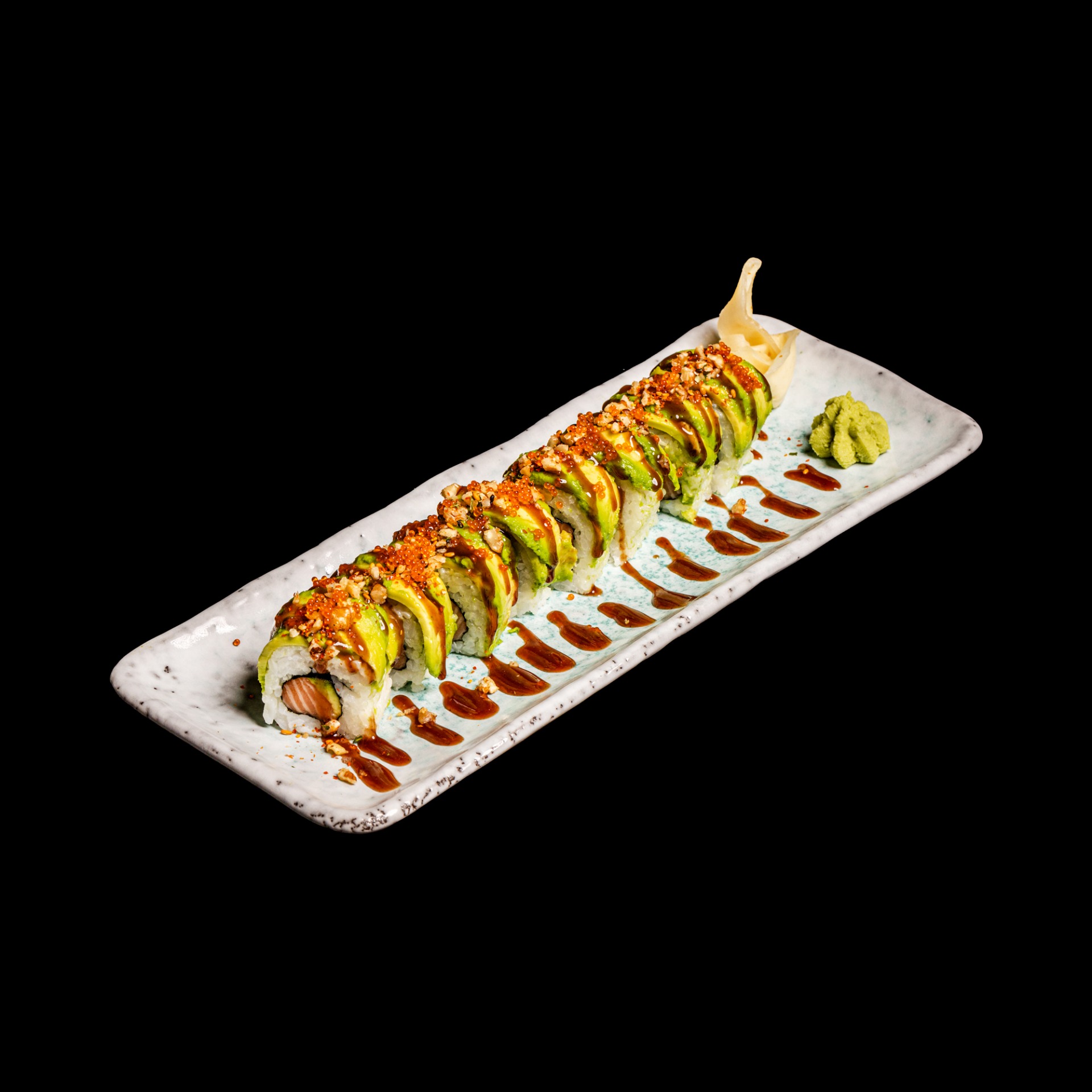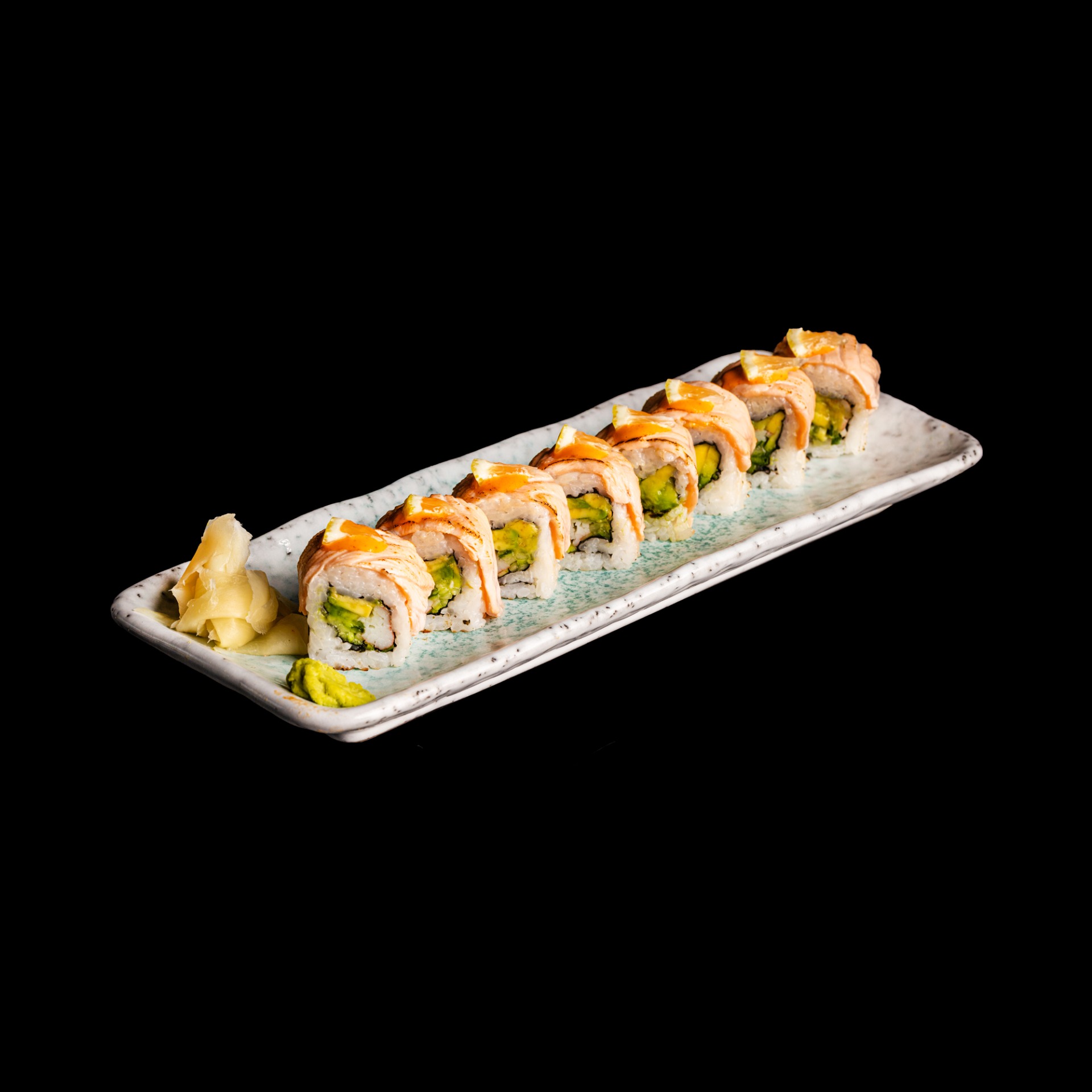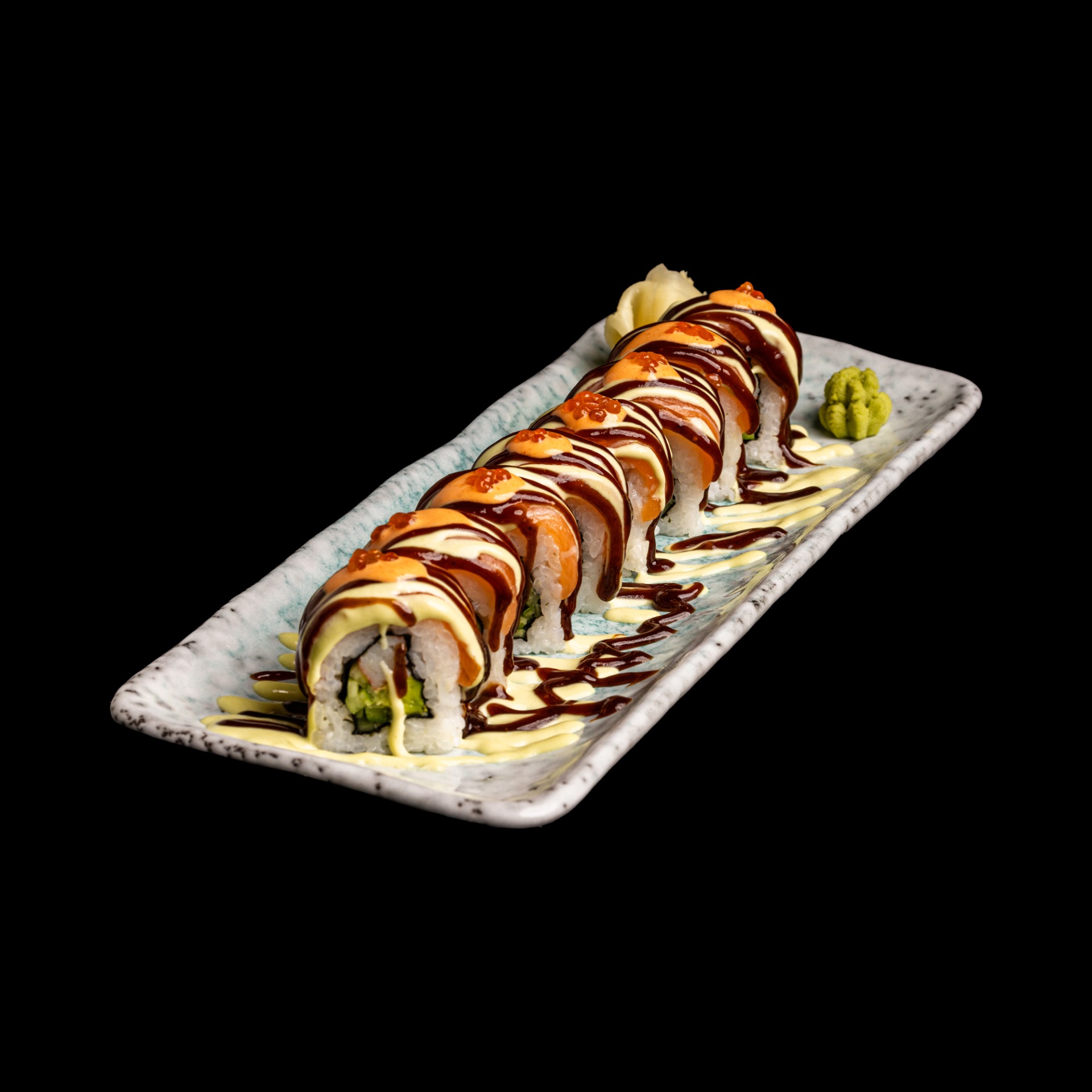 Crabstick, avocado and tanoki wrapped in salmon belly and honey wasabi sauce.