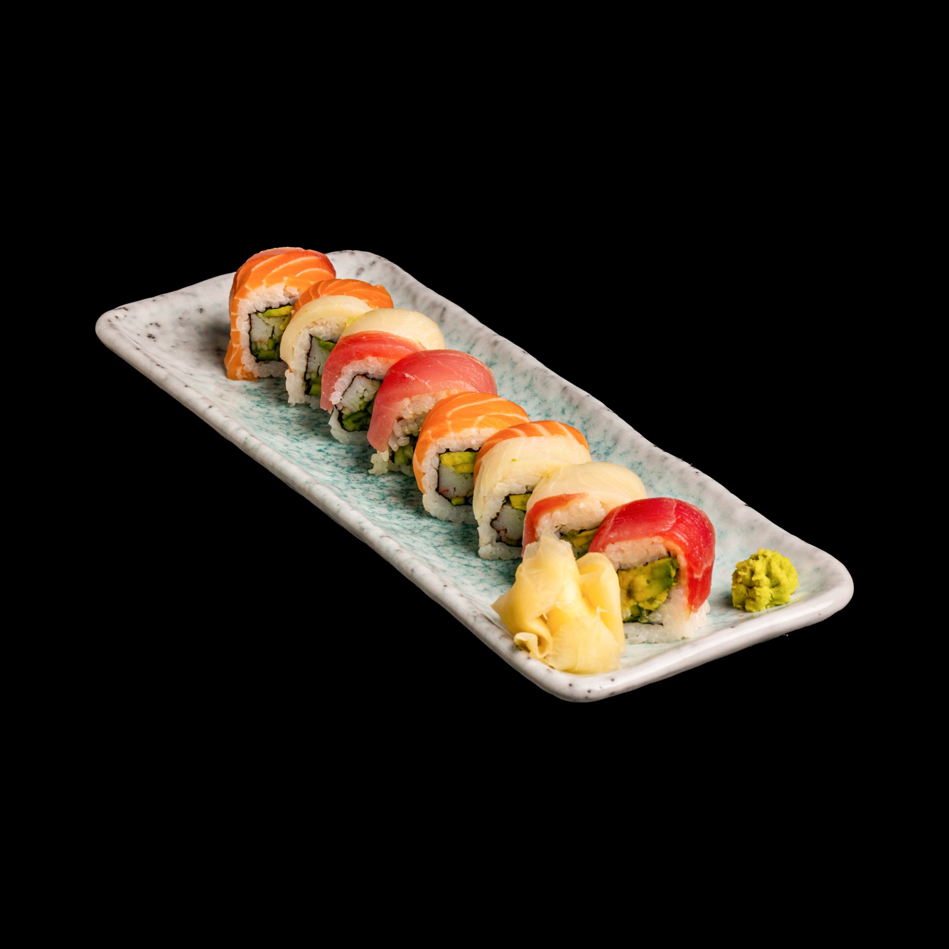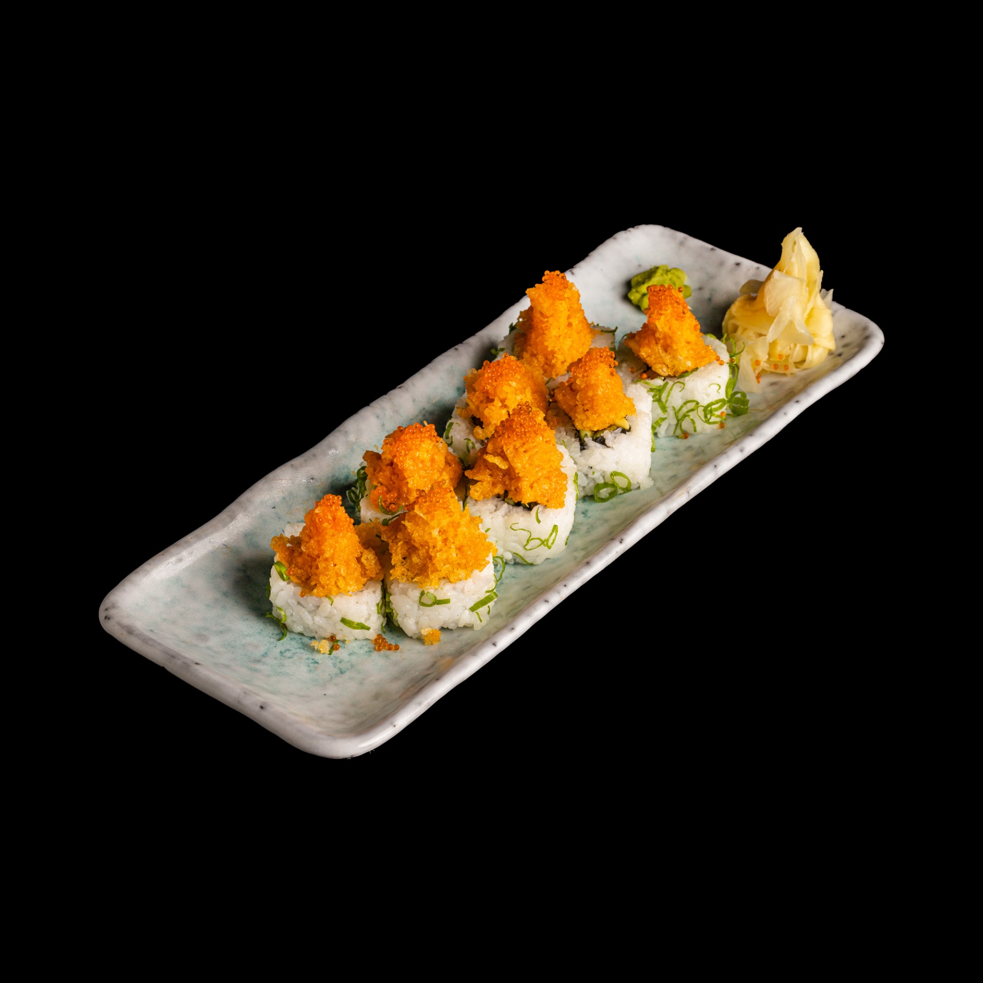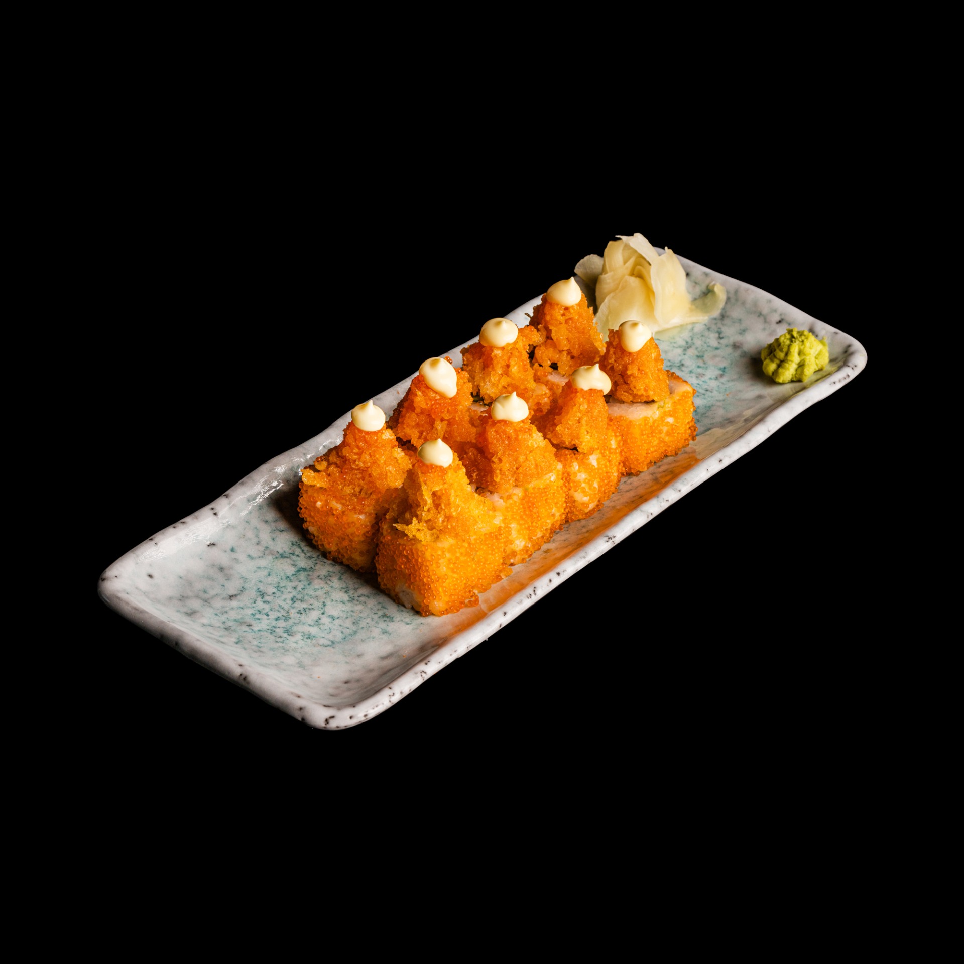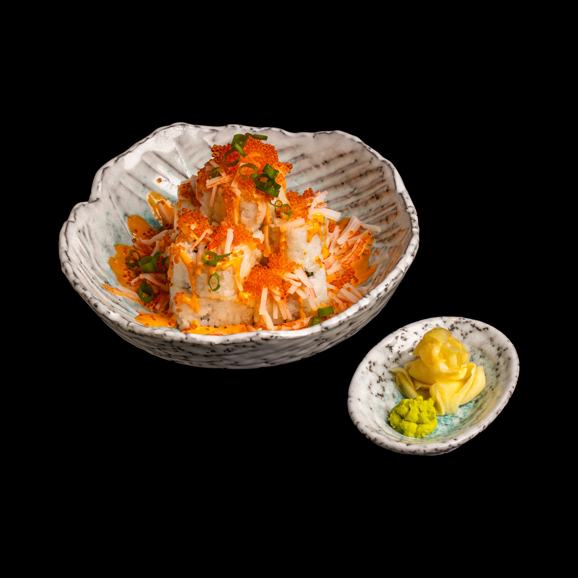 Crabstick, avocado and tanoki wrapped in salmon belly and honey wasabi sauce.