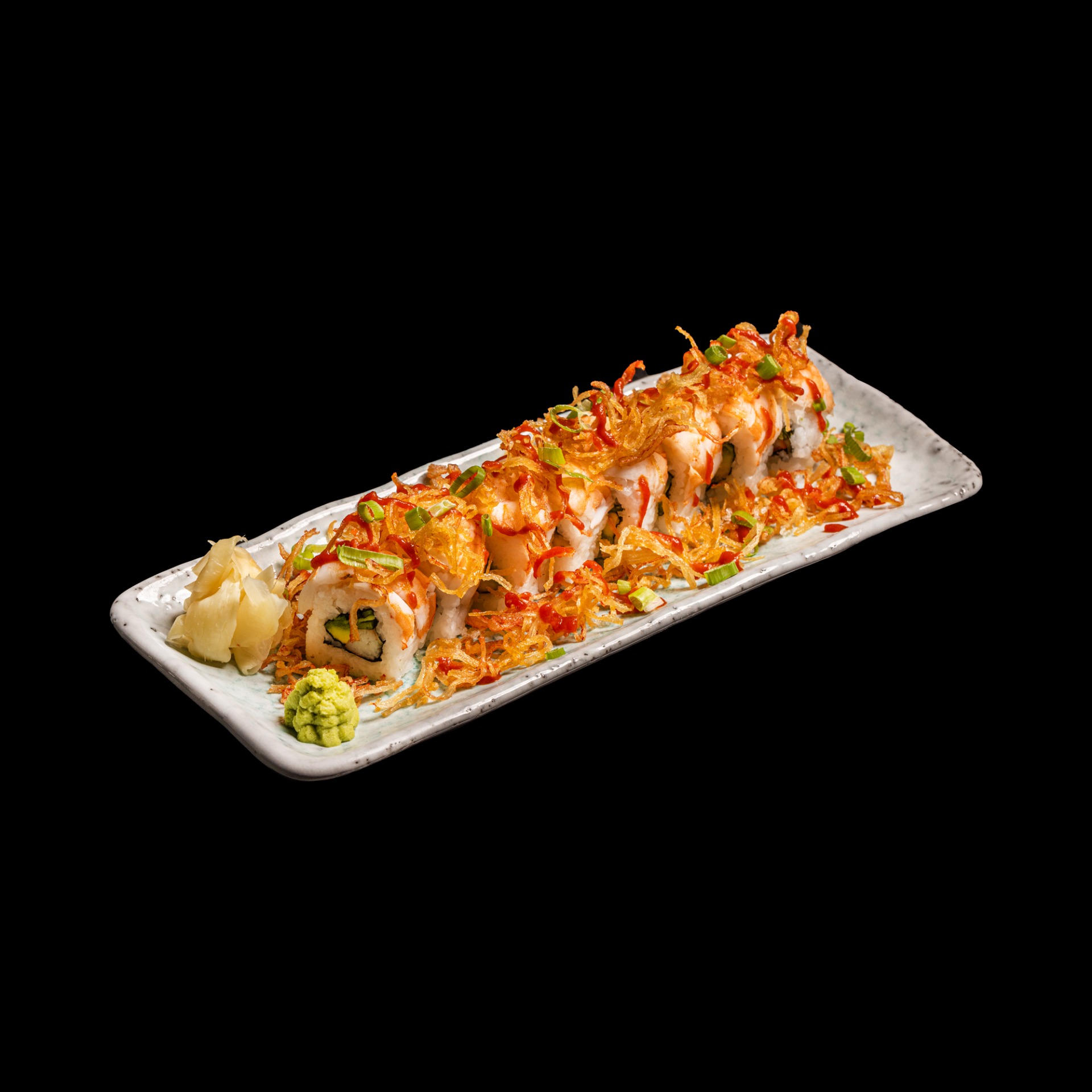 Fresh salmon, crispy fry salmon skin and cucumber rolled in torched fresh salmon topped with spicy