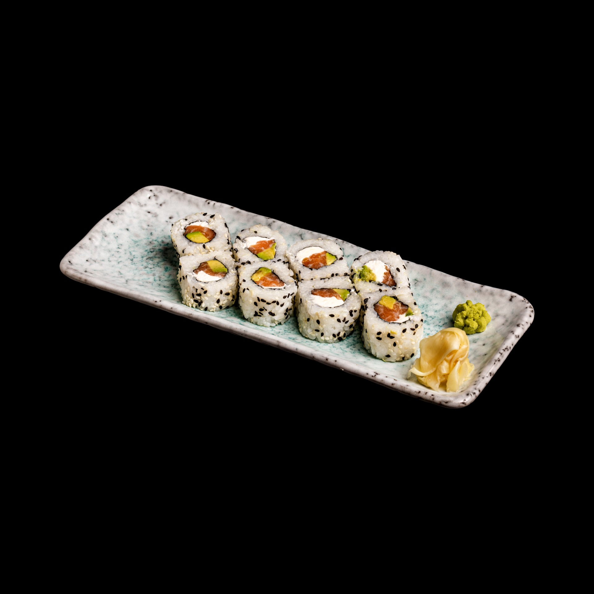 Fresh salmon, avocado and cream cheese rolled in black and white sesame seeds.